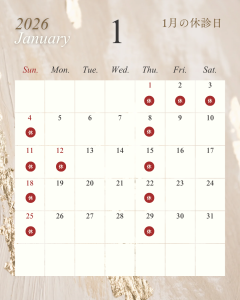 2025.12.15 / 医院情報 ❄️1月休診日のお知らせ❄️ いつもご利用いただきありがとうございます☺️ 1月の休診日のお知らせです☃️ 1月は1日〜4日 休診 12日 成人の日の為休診となります。 通常通り木曜日、日曜日はお休みです。 皆様には大変ご不便おかけいたしますが 何卒宜しくお願い致します。 < 前へ